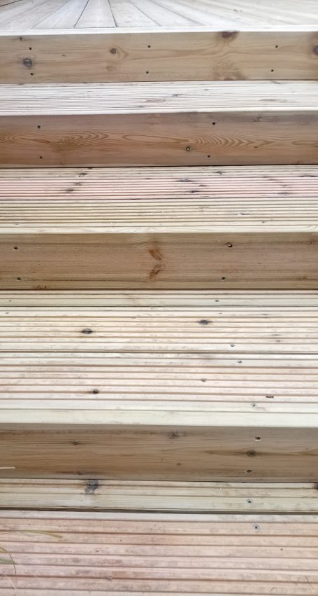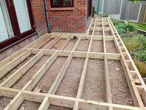 Old deck boards removed revealing a rotten and badly installed framework. The original installer had placed the framework directly onto the soil. The soil was dug down to ensure breathing space for the new 6x2 deck frame and re laid with new deck boards and decking steps to the lawn.